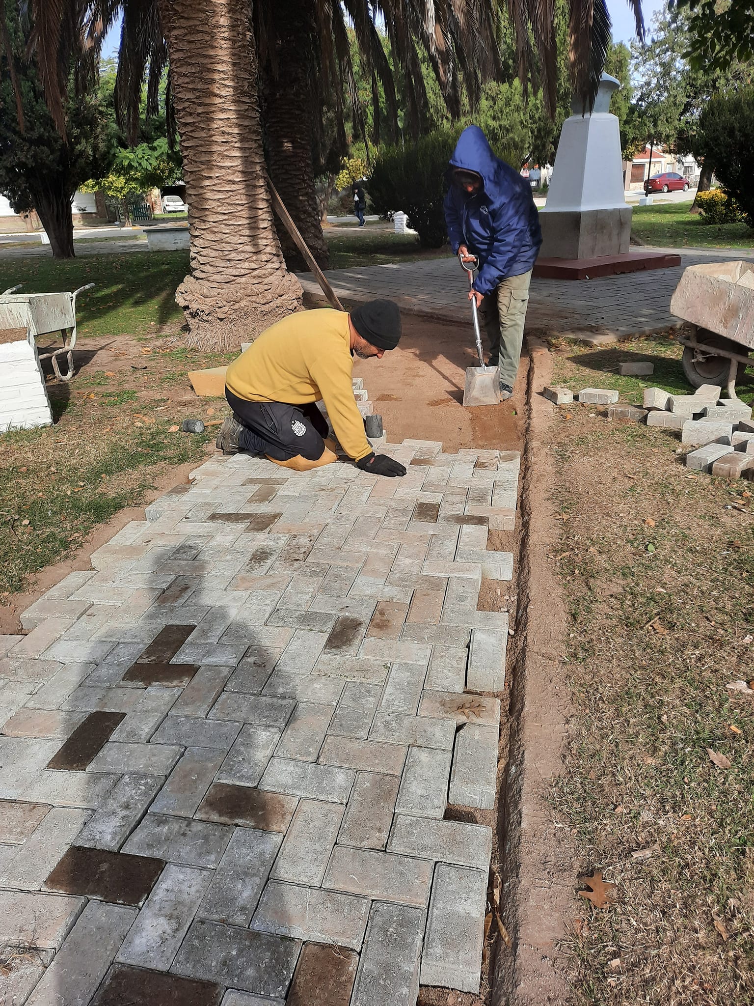 En plaza «Almirante Brown» levantamos las lajas del pasillo que lleva a la iglesia y lo estamos reconstruyendo para mejor circulación.