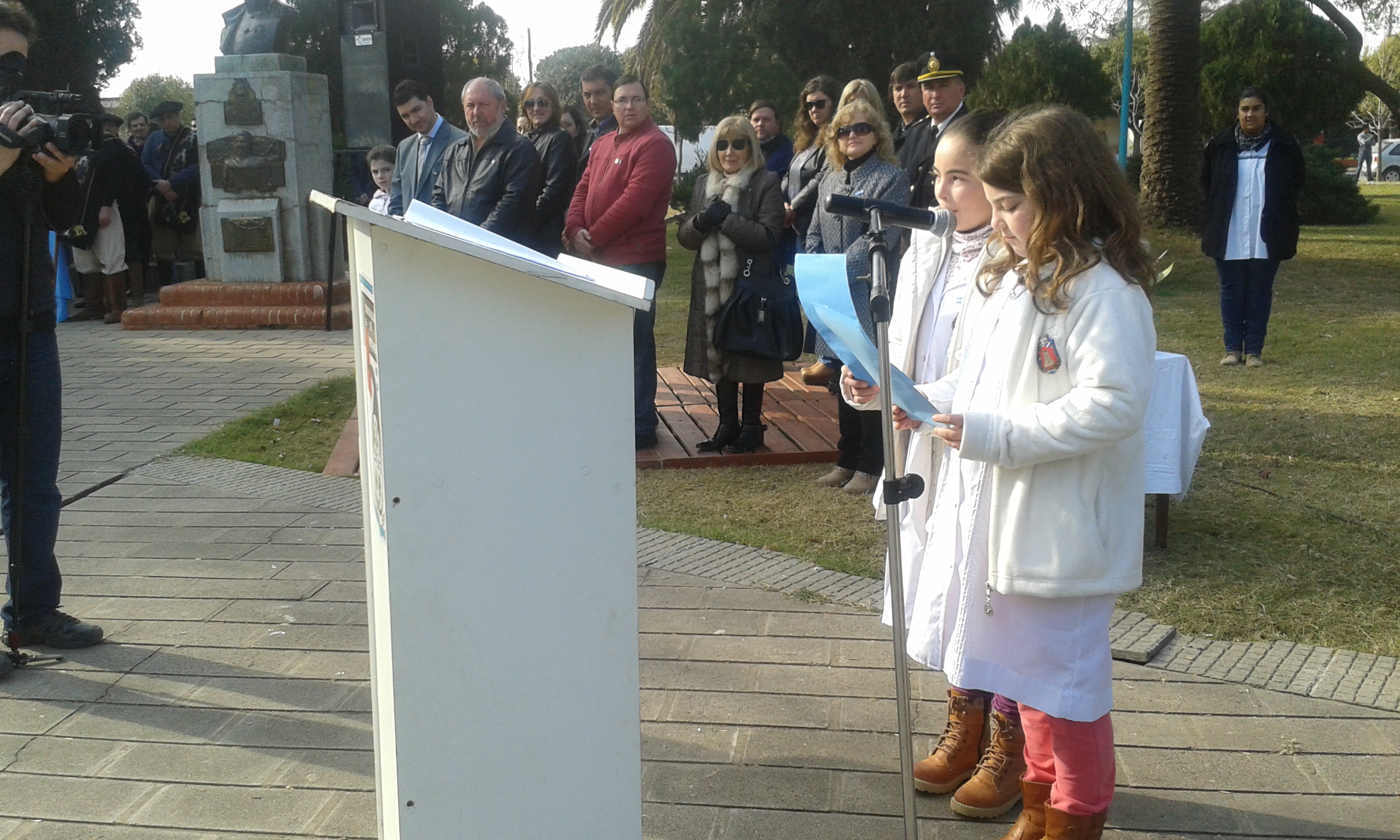 Las alumnas: Aylin Vanzetti (Escuela L. N. Alem); y Ángeles Piana y Candela Perzi (Escuela Remedios E. de San Martín), dejaron su mensaje sobre estas fechas históricas, mediante el recitado de sendas poesías.-
