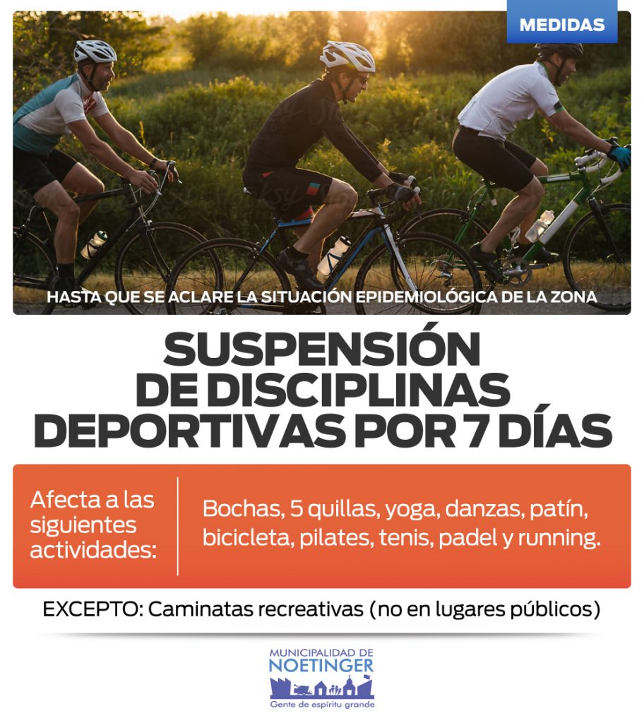 🚴♂️ 🏃♀️ 🎾🎱 Desde hoy y por el término de 7 (siete) días se suspenden todas las actividades deportivas quedando exceptuada la CAMINATA RECREATIVA teniendo en cuenta las medidas de protección y prevención.