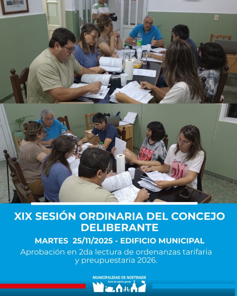 El  martes 25/11/2025, desde las 20:00 horas, en el edificio municipal, se desarrolló la “XIX Sesión Ordinaria  con la presencia de los concejales Enzo F. Henze (Presidente), Franca E. Biasella (Vicepresidente 1º), Agustina A. Sanchez (Vicepresidente 2º)y Javier Díaz (bloque “Hacemos Unidos por Córdoba”), y Concejales Carlos Coppola, Analía Juarez Obrvan  yGabriela Francioni  (bloque “Juntos por el Cambio”);   para dar tratamiento al siguiente “Orden del Día”:
