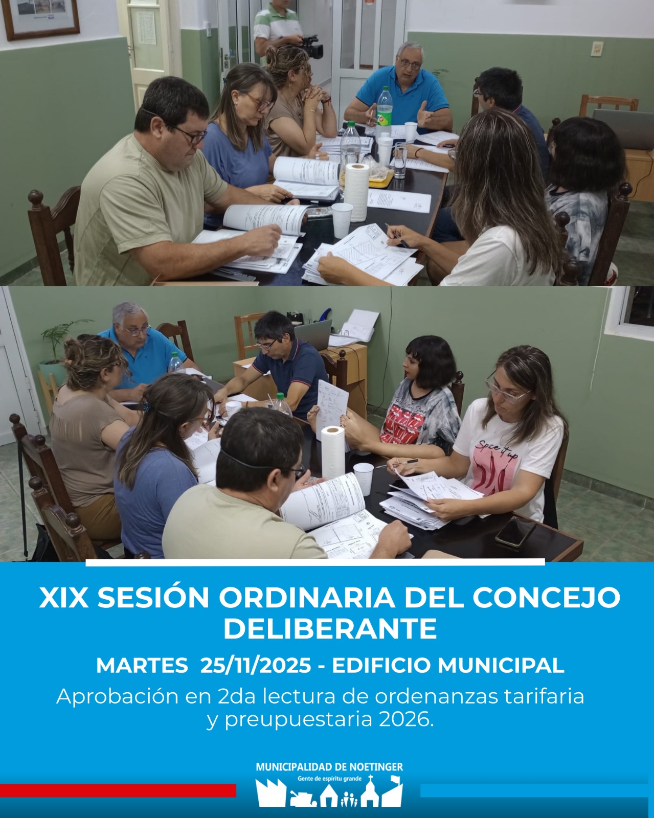 El  martes 25/11/2025, desde las 20:00 horas, en el edificio municipal, se desarrolló la “XIX Sesión Ordinaria  con la presencia de los concejales Enzo F. Henze (Presidente), Franca E. Biasella (Vicepresidente 1º), Agustina A. Sanchez (Vicepresidente 2º)y Javier Díaz (bloque “Hacemos Unidos por Córdoba”), y Concejales Carlos Coppola, Analía Juarez Obrvan  yGabriela Francioni  (bloque “Juntos por el Cambio”);   para dar tratamiento al siguiente “Orden del Día”:
