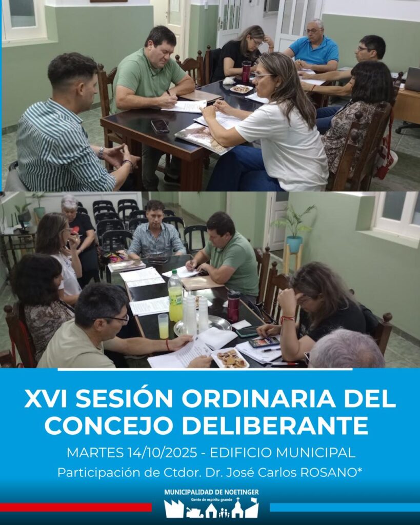 El martes 14/10/2025, a partir de las 19.30 horas, en el edificio municipal, se desarrolló la “XVI Sesión Ordinaria”, con la presencia de los concejales Enzo F. Henze (Presidente), Franca E. Biasella (Vicepresidente 1º), Agustina A. Sanchez (Vicepresidente 2º)y Javier Díaz (bloque Hacemos Unidos por Córdoba), y Concejales Carlos Coppola y Analía Juarez Obrvan (bloque “Juntos por el Cambio”), ausente con previo aviso Gabriela Francioni; para dar tratamiento al siguiente “Orden del Día”: